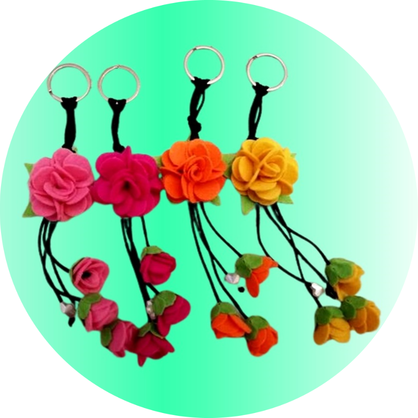 Chaveiro mini rosa em feltro, com argola em metal e mais 3 flores menos penduradas. É uma delicada e útil lembrança para marcar momentos.